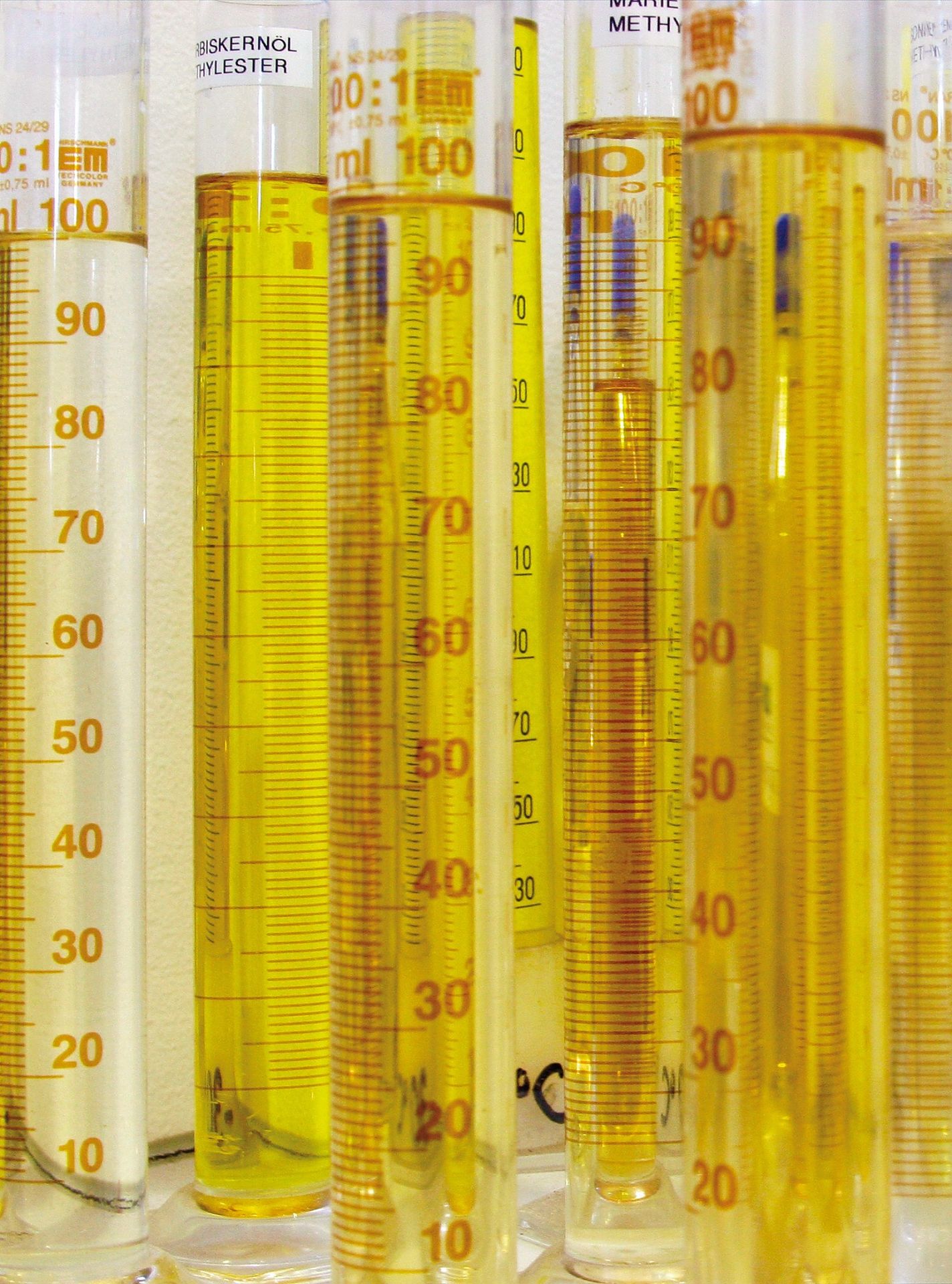 Messzylinder mit verschiedenen Biodieselproben.