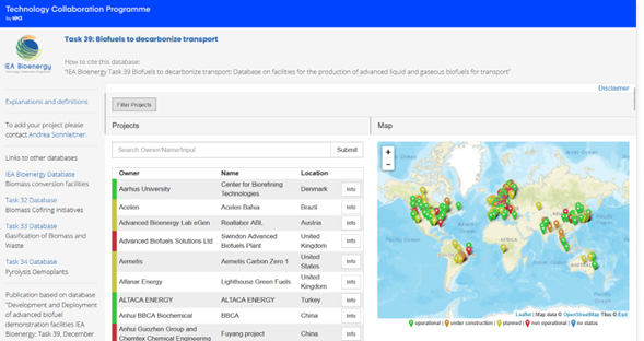 Ein Screenshot der IEA Bioenergy Task 39 Datenbank der Demonstrationsanlagen fortschrittlicher Biotreibstoffe. Man sieht die Auflistung von Projekten und deren Status in Tabellenform und auch in einer Landkarte dargestellt.
