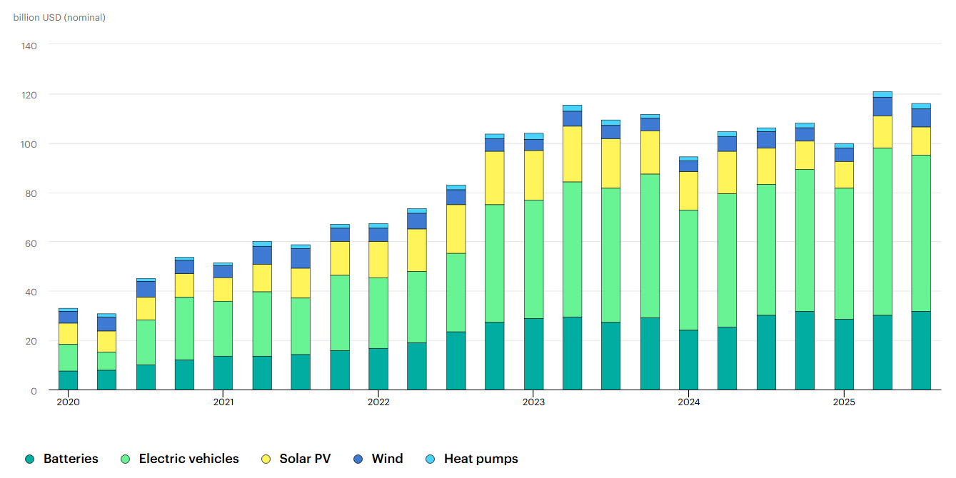 Die Investitionsdynamik in die Fertigung sauberer Energietechnologien hat sich nach dem Höchststand im Jahr 2023 abgeschwächt und lag 2024 bei knapp unter 200 Mrd. US-Dollar. Für 2025 wird ein weiterer Rückgang erwartet, vor allem aufgrund schwächerer Investitionen in Solar-PV und Wind.