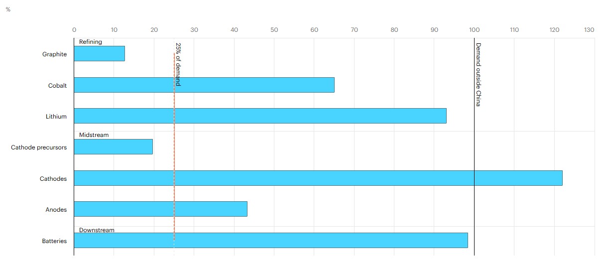 Eine neue Analyse zeigt, dass die globale Nachfrage auch ohne den größten Exporteur für saubere Energietechnologien grundsätzlich gedeckt werden könnte, jedoch weiterhin Engpässe entlang der Lieferketten bestehen. In allen zentralen Wertschöpfungsketten gibt es mindestens einen kritische „Schwachstelle" bei der weniger als ein Viertel der Nachfrage außerhalb Chinas durch Angebot außerhalb Chinas gedeckt werden könnte.
