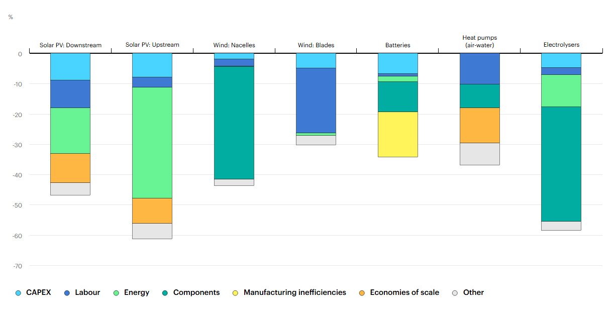 Bei Batterien lassen sich über 40 % des Kostenunterschieds zu Europa durch eine höhere Produktionseffizienz erklären. In der Solar- und Windfertigung hingegen spielen vor allem Energie- und Lohnkosten eine große Rolle. Bei Elektrolyseuren ist die Produktion noch nicht stark industrialisiert, sodass verschiedene Standorte weiterhin wettbewerbsfähig sein können.
