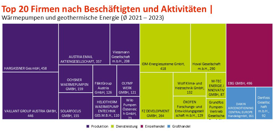 Ein Blick auf die führenden österreichischen Firmen im Bereich Wärmepumpen und geothermische Energie zeigt, dass der Großteil der Beschäftigten in der Produktion und im Dienstleistungssektor tätig ist, während Einzel- und Großhandel nur einen kleinen Anteil ausmachen. Unter den Unternehmen finden sich etwa die OCHSNER Wärmepumpen GmbH und iDM Energiesysteme GmbH, welche auch aktiv an Forschung- und Entwicklungsprojekten beteiligt sind.