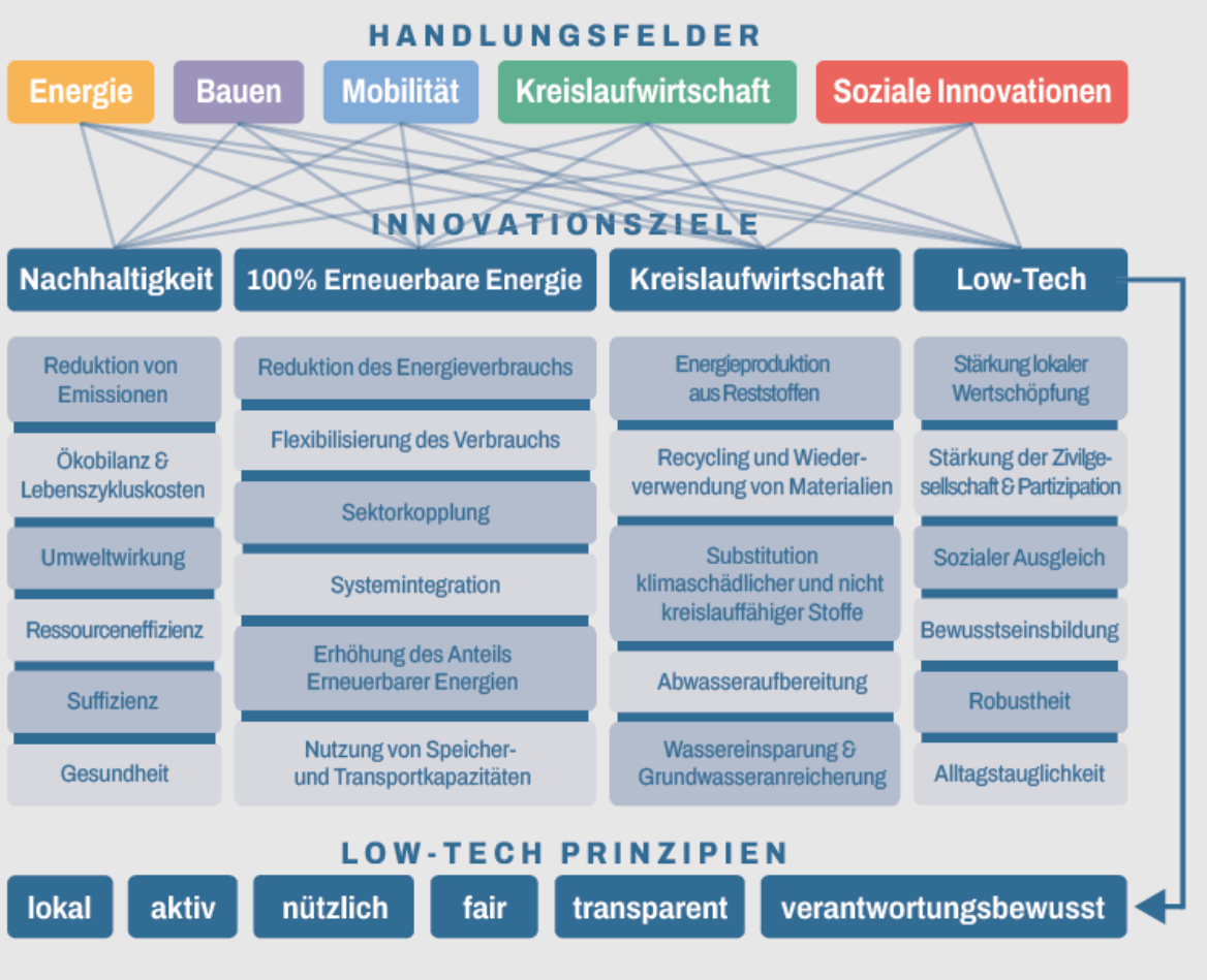 Ergänzend dazu erfolgte auf wissenschaftstheoretischer Basis die Definition handlungsleitender Low-Tech Aspekte (=lokal, aktiv, nützlich, fair, transparent, verantwortungsbewusst) sowie die Ableitung konkreter Innovationsziele.
