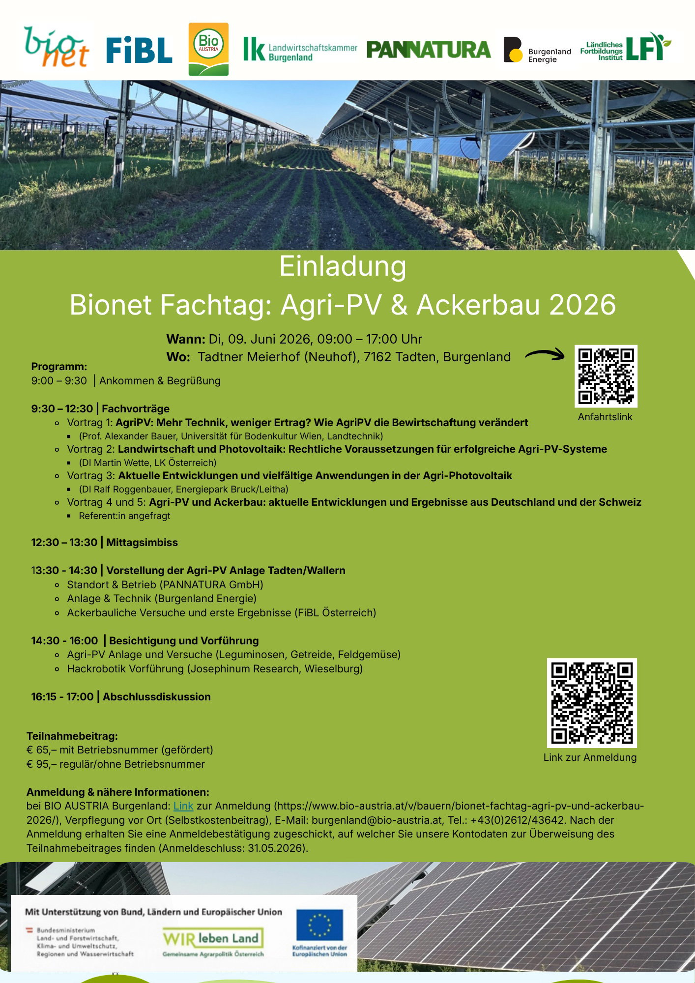 Fachvorträge finden am Vormittag statt. Am Nachmittag ist die Vorstellung der großen Agri-PV-Anlage in Tadten/Wallern sowie die Besichtigung der ackerbaulichen Versuche geplant, die vom FiBL wissenschaftlich begleiten werden.