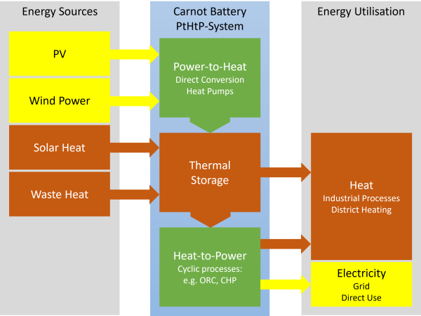 The aim of the IEA ES Task 44 of the International Energy Agency is to examine the role of Power-to-Heat (PtH) applications and heat-integrated Carnot battery systems (PtHtP, see Figure 1) in the decarbonization of industrial processes and connected heat and power networks. For this purpose, suitable system concepts and use cases for different technology configurations are identified and evaluated. The following development steps are planned for the overall project: