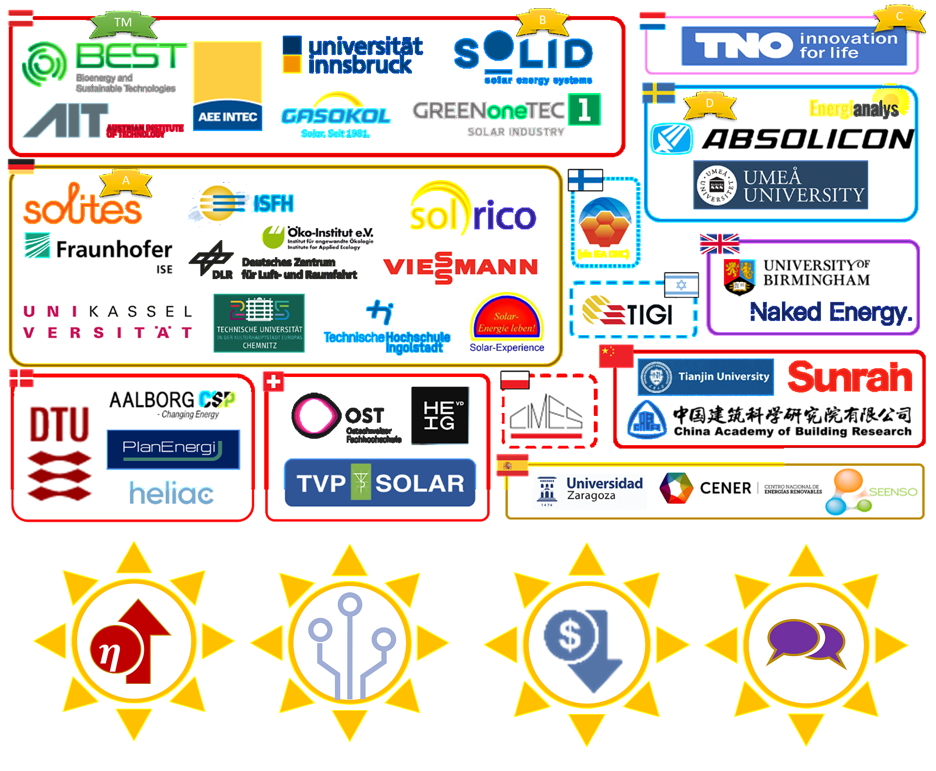 Logo-Board der an IEA SHC Task 68 teilnehmenden Staaten und Institutionen (Hochschulen, Forschungseinrichtungen und Unternehmen). Dabei sind das Task-Management (TM) und die Subtask-Leitungen (A bis D) speziell hervorgehoben. Darunter sind die Schlüsselthemen in IEA SHC Task 68 dargestellt: Höhere Wirkungsgrade (Subtask A), digitale Lösungen (Subtask B), Kosten senken (Subtask C) und Dissemination / Kommunikation (Subtask D)