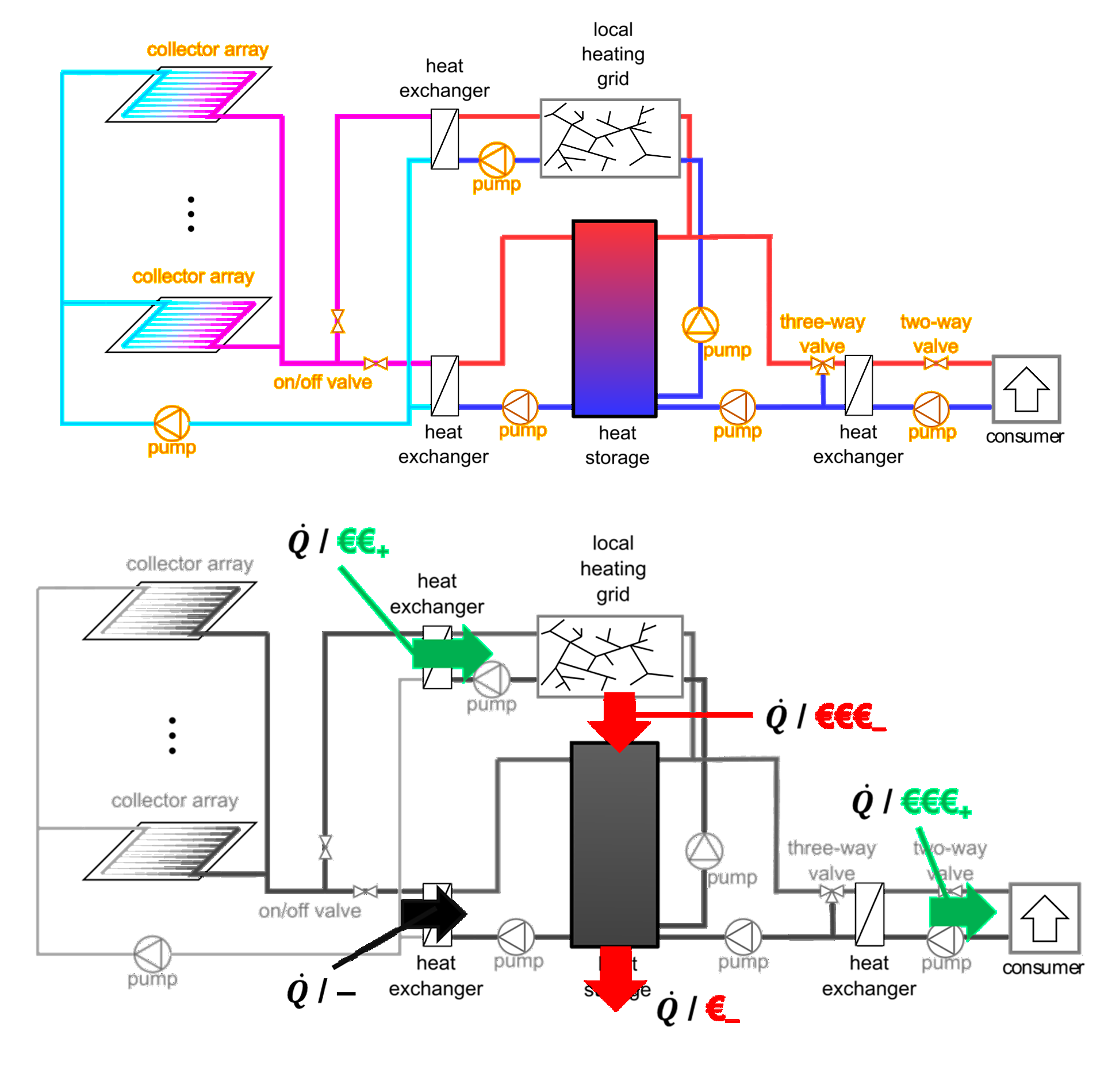 Allgemeine Struktur solarer Fernwärme (oben) sowie wichtige Wärme- und Erlösströme (unten): In der Abbildung sind Solarkollektoren, Wärmeübertrager, ein Pufferspeicher, Pumpen, Ventile, das Netz und Verbraucher eingezeichnet.