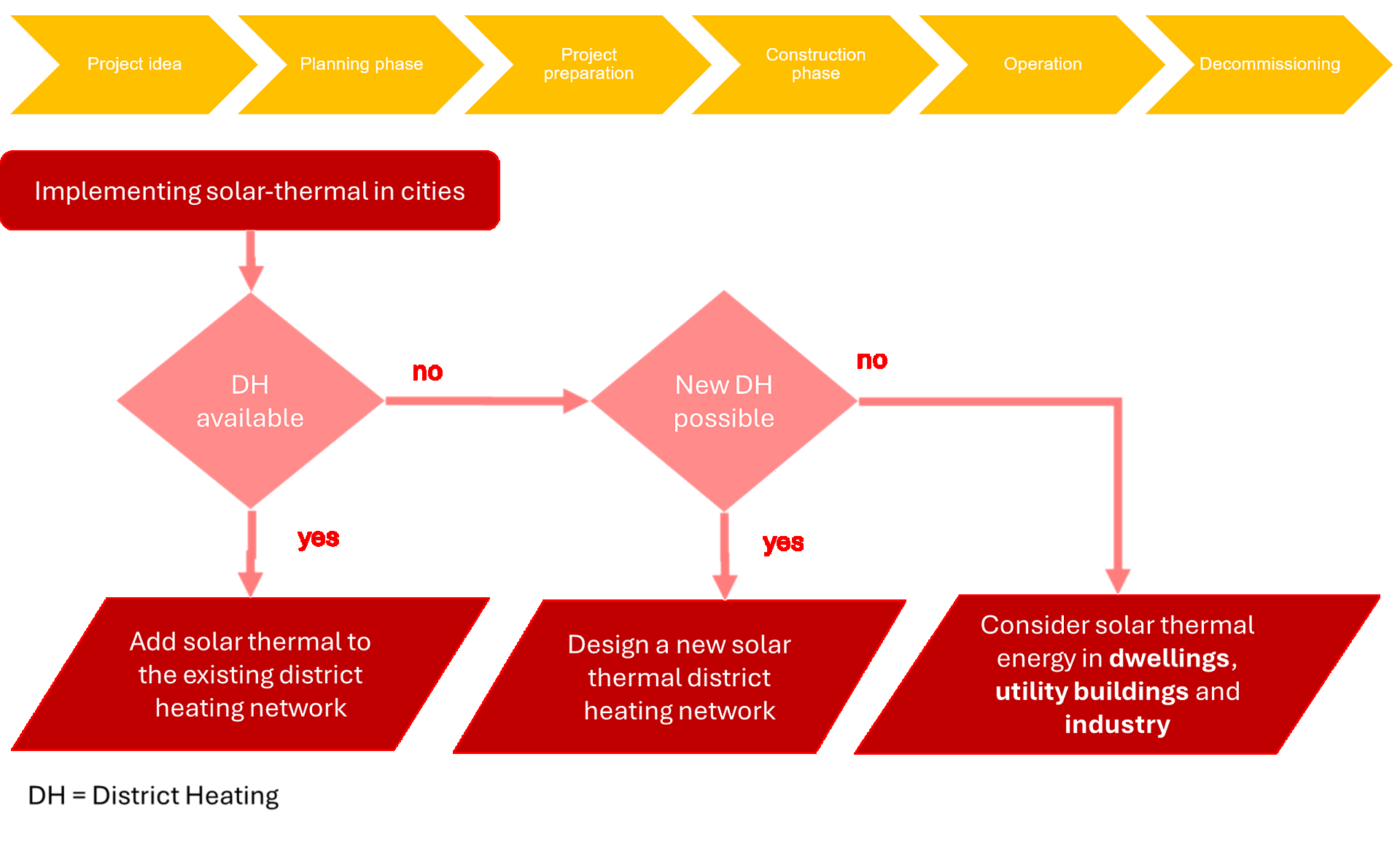 Phasen im Lebenszyklus einer Solaranlage (oben), Ablaufplan für die Entscheidung über die Implementierung solarer Fernwärme (unten)