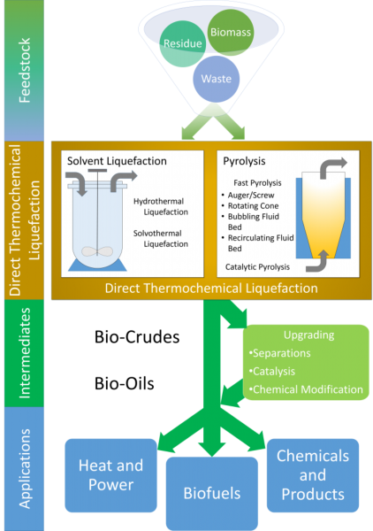 Der IEA Bioenergy Task 34 fokussiert auf die thermochemische Verflüssigung nachhaltiger Biomasse für Transportkraftstoffe, Bioenergie und Chemikalien. Während in der Vergangenheit hauptsächlich Nutzungsmöglichkeiten für Pyrolyseöle aus der schnellen Pyrolyse untersucht wurden, wird zunehmend ein Fokus auf die Co-Produktion von anderen Produkten wie Biokohle, erneuerbare Gase und Bioenergie gelegt, was die Wirtschaftlichkeit von Pyrolyseanlagen verbessern soll. Damit wird die Pyrolysetechnologie eine wichtige Rolle für die CO2-negative Treibstoff- und Bioenergieproduktion spielen.