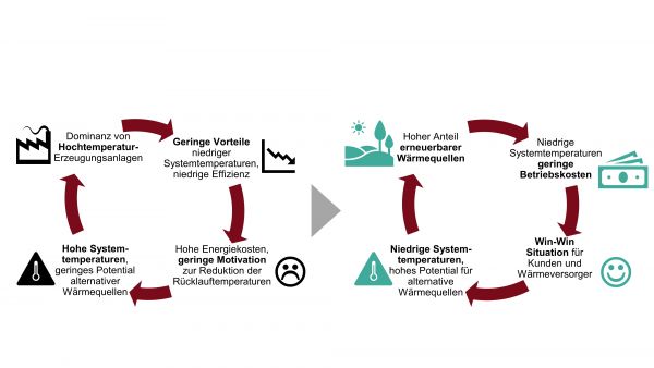 Sich ändernde Marktbedingungen und die Notwendigkeit zur Vermeidung jeglicher CO2-Emissionen machen es notwendig, die gegenwärtigen Erzeugungsstrukturen in der Wärmeversorgung zu überdenken. Da erneuerbare Brennstoffe zunehmend für den Industrie- und Mobilitätssektor verwendet werden, spielen im Bereich der Wärmeversorgung alternative Quellen wie Solar- und Geothermie, Umgebungswärme und Abwärme sowie der Einsatz von Wärmepumpen eine immer größere Rolle. Deren Potential bzw. Wirtschaftlichkeit ist bei niedrigen Systemtemperaturen am höchsten, aktuelle Fernwärmenetze sind aber von hohen Temperaturniveaus dominiert. Entsprechend ist neben der Installation von Niedertemperatursystemen (sogenannte Fernwärmenetze der 4. Generation (4GDH) die Senkung der Systemtemperaturen in Bestandsystemen von entscheidender Bedeutung für eine nachhaltige Dekarbonisierung.