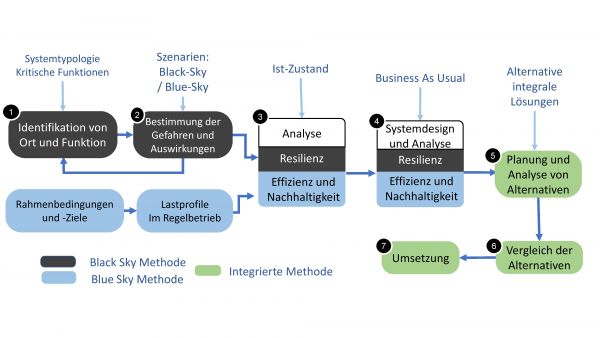 Um die Situation zu verbessern, ist es nötig, dass Planern zielführende Werkzeuge zur Verfügung stehen, um Gebäudekomplexe und ihre Versorgungssysteme integriert zu betrachten. Neben einem Planungsprozess zur Integration von Resilienz wurde im Projekt auch ein Berechnungs- und Simulationstool entwickelt und anhand von Pilotstudien getestet. Dabei wird die Resilienz von Gebäudekomplexen und ihren Energieversorgungsanlagen geprüft. Der Prozessablauf und das Bewertungstool sorgen durch ihre Ausrichtung dafür, dass innovative Energieversorgungsmodelle und Verteilungsstrategien in den Planungsprozess integriert werden.