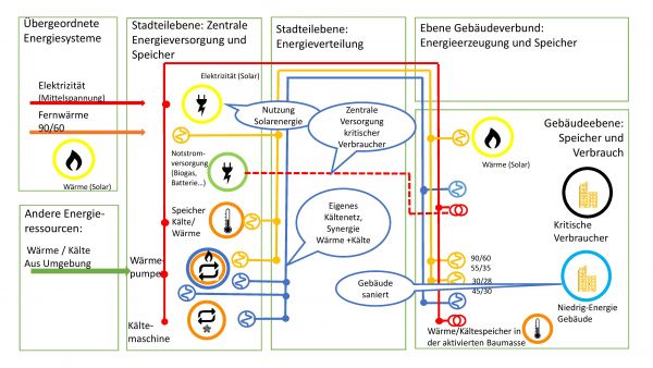 Dabei muss das Augenmerk auf der Nutzung von Energien aus lokalen, erneuerbaren Quellen liegen. Indem der Bedarf an Wärme, Kälte und elektrischer Energie von mehreren Gebäuden gemeinsam untersucht, reduziert und optimiert wird, können signifikante Einsparungen bei Energie und eine höhere Versorgungssicherheit erreicht werden. Der aktuelle Standard beim Planen und Bauen führt nicht zur Erreichung der Energie-Ziele aus EPBD, und senkt auch nicht die Kosten für Energiesicherheit.