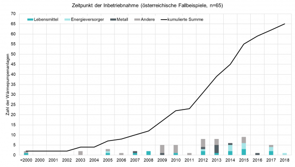 Am häufigsten werden Wärmepumpen derzeit in der Lebensmittelindustrie eingesetzt, üblicherweise zum gleichzeitigen Heizen und Kühlen, wie zum Beispiel Kältemaschinen mit Abwärmenutzung. Die Heizleistungen der erhobenen Beispiele liegen im Bereich von einigen 10 bis 100 kW, die Wärme wird zumeist im Betrieb selbst genutzt (Gebäude- und Hallenheizung, sowie Prozesswärme).