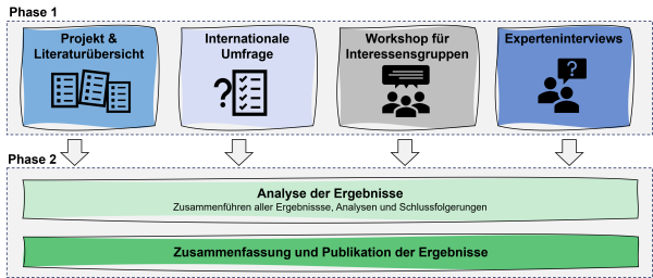 In einer ersten Phase werden die Daten aus Pilotprojekten im Rahmen allgemeiner Umfragen und E-Mail-Befragungen sowie auch spezifische ExpertInneneninterviews erhoben.