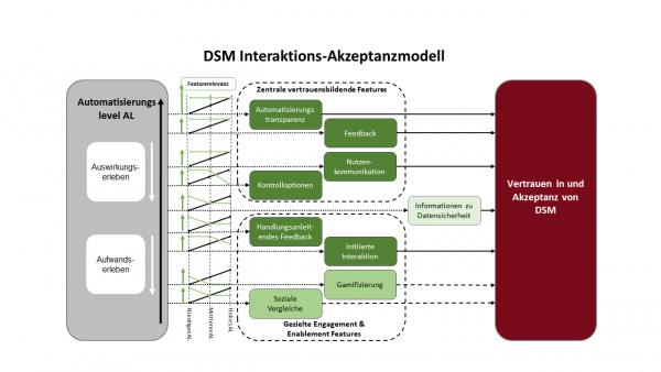 In Bezug auf interaktionsbezogene Akzeptanzfaktoren lässt sich zusammenfassend sagen, dass sich die Rolle von Nutzer:innen-Schnittstellen zu Demand Side Management in Abhängigkeit von Automatisierungslevel und damit verbundenem Auswirkung- und Aufwandserleben ändert. Wenn das Automatisierungslevel niedrig ist und die Auswirkungserfahrung und der Aufwand hoch sind, liegen die Hauptaufgaben von Interaktionssystemen in aktiver Ansprache von Teilnehmer:innen, der Bereitstellung handlungsanleitender Informationen, zeitnahem Feedback, sowie einer deutlichen Nutzenkommunikation, die dem erforderlichen Aufwand entspricht. Mit steigendem Automatisierungslevel geht die Aufgabe, die Nutzer:innen zum Handeln zu bewegen, von einer Schlüsselphase der Kontrollvermittlung bei mittlerem Automatisierungslevel zu einer Phase der Rechenschaftslegung, Transparenz und Rechtfertigung durch die Kommunikation von Ergebnissen bei hohem Automatisierungslevel über.