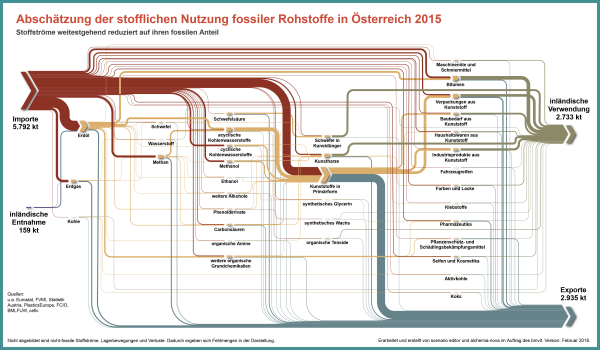 2015 wurden nach Österreich rund 5.800 kt fossile Rohstoffe und Produkte für die stoffliche Nutzung (ohne Energie) importiert. Hinzu kamen rund 150 kt fossile Rohstoffe (Erdöl und Erdgas) aus dem Inland. Daraus wurden rund 2.750 kt an fossilen Produkten für die Verwendung im Inland und rund 2.950 kt für den Export gefertigt.