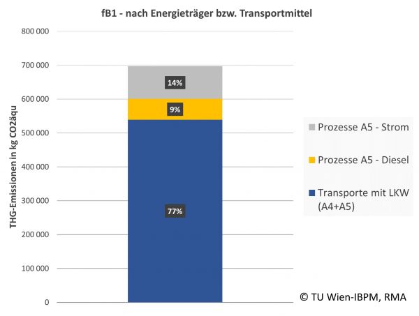Die Ergebnisse der THG-Emissionen der vier fiktiven Baustellen zeigen, dass die wesentlichen Energieträger für die Baustellenaktivitäten Diesel und Strom sind. Einen großen Anteil an den Treibhausgas-Emissionen bei der Bautätigkeit bildet der An- und Abtransport von Materialien per LKW. Die Anteile variieren nach Baustellentyp.