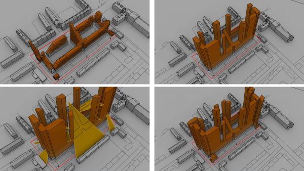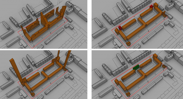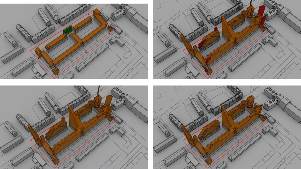 - Aufstellen von Regeln und Algorithmen: Das städtische Gebiet wird in Form von „positivem" (bebautem) und „negativem" (unbebautem) Raum repräsentiert. Innerhalb des negativen Raums werden nicht bebaubare Flächen – wie zum Beispiel jene die dem Straßenraum, öffentlichen Parks oder Plätzen zugeordnet sind – identifiziert und das verbleibende Volumen hinsichtlich der zuvor genannten Parameter und Beschränkungen untersucht. Dabei werden verschiedene Szenarien (vertikale und/oder horizontale Verdichtung) generiert und verglichen.