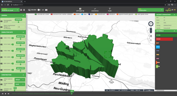 Im Simulations- und Visualisierungstool können auf Basis der Datengrundlage die Bestände und Veränderungen der Materialmengen für unterschiedliche Materialien bzw. Materialgruppen dargestellt werden. Die räumliche Auflösung der Darstellung geht dabei bis auf Baublockebene. Die Umsetzung erfolgt als webbasierter Proof-of-Concept-Prototyp. Die für die Simulation umgesetzten Funktionalitäten und relevanten Fragestellungen wurden mittels Szenarientechnik erarbeitet und in Workshops mit der Stadtverwaltung, Vertreter:innen der Bau- und Abfallwirtschaft erörtert und diskutiert. Anhand von konkreten Fallbeispielen werden zudem bestehende BIM-Schnittstellen und Standards analysiert und den identifizierten Anforderungen aus der Analyse von Bau- und Planungsprozessen gegenübergestellt. Aus diesen Erkenntnissen und im Austausch mit Akteur:innen der Planungs- und Bauwirtschaft und auch der Verwaltung (in Workshops und zahlreichen Expert:innen-Gesprächen) werden Handlungsempfehlungen und Prozessentwürfe zur steten Verbesserung der Datenlagen (mit Hilfe von BIM) formuliert und entwickelt.