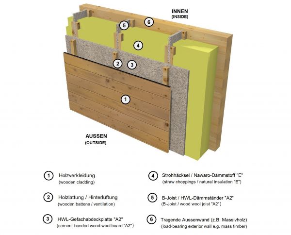 Entwicklung einer Brandschutzausrüstung von Strohhäcksel-Einblasdämmung zur Erzielung der Schwerentflammbarkeit anhand biogener Flammschutzmittel materialverwandter Stoffe und deren Applikationsverfahren. Anwendung des Materials als thermische Gebäudedämmung bei der Vorfertigung materialreduzierter Holzbauelemente für die urbanen Gebäudeklassen 4 und 5 mit bis zu 6 Geschossen.